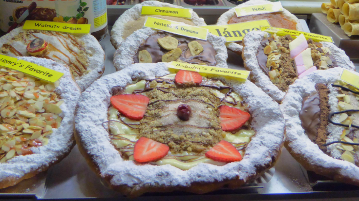 You'll find sweet and savoury Lángos all over Hungary, such as these examples sold at Budapest's Great Market Hall. / Image owned by author