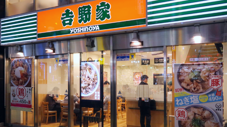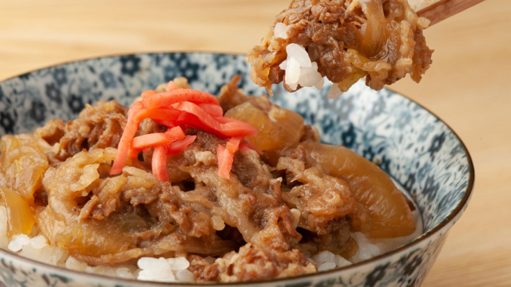 - Gyudon Chains - Gyudon (牛丼) is a popular and affordable dish. Aka. a bowl of rice topped with thinly sliced beef and onions simmered in a savory-sweet sauce. Chains such as Yoshinoya, Sukiya and Matsuya serve gyudon and other similar options at affordable prices and with 24-hour service.