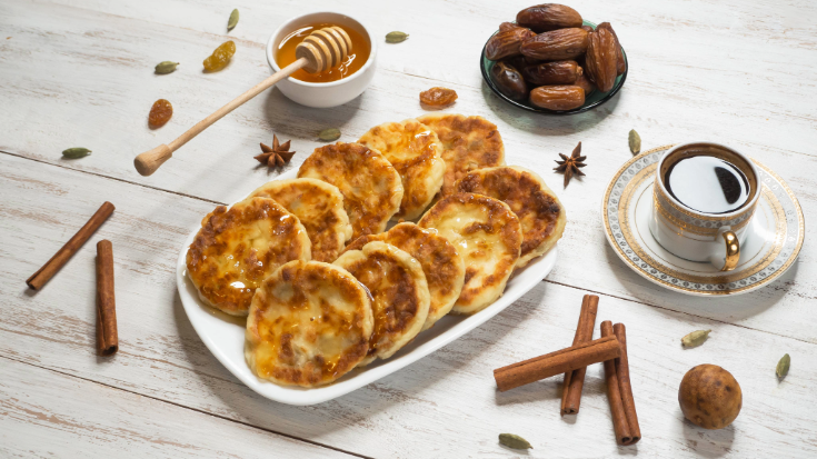 Msabeeb is a traditional breakfast food of Saudi Arabia. These mini pancakes are made with wheat flour and served with honey.
