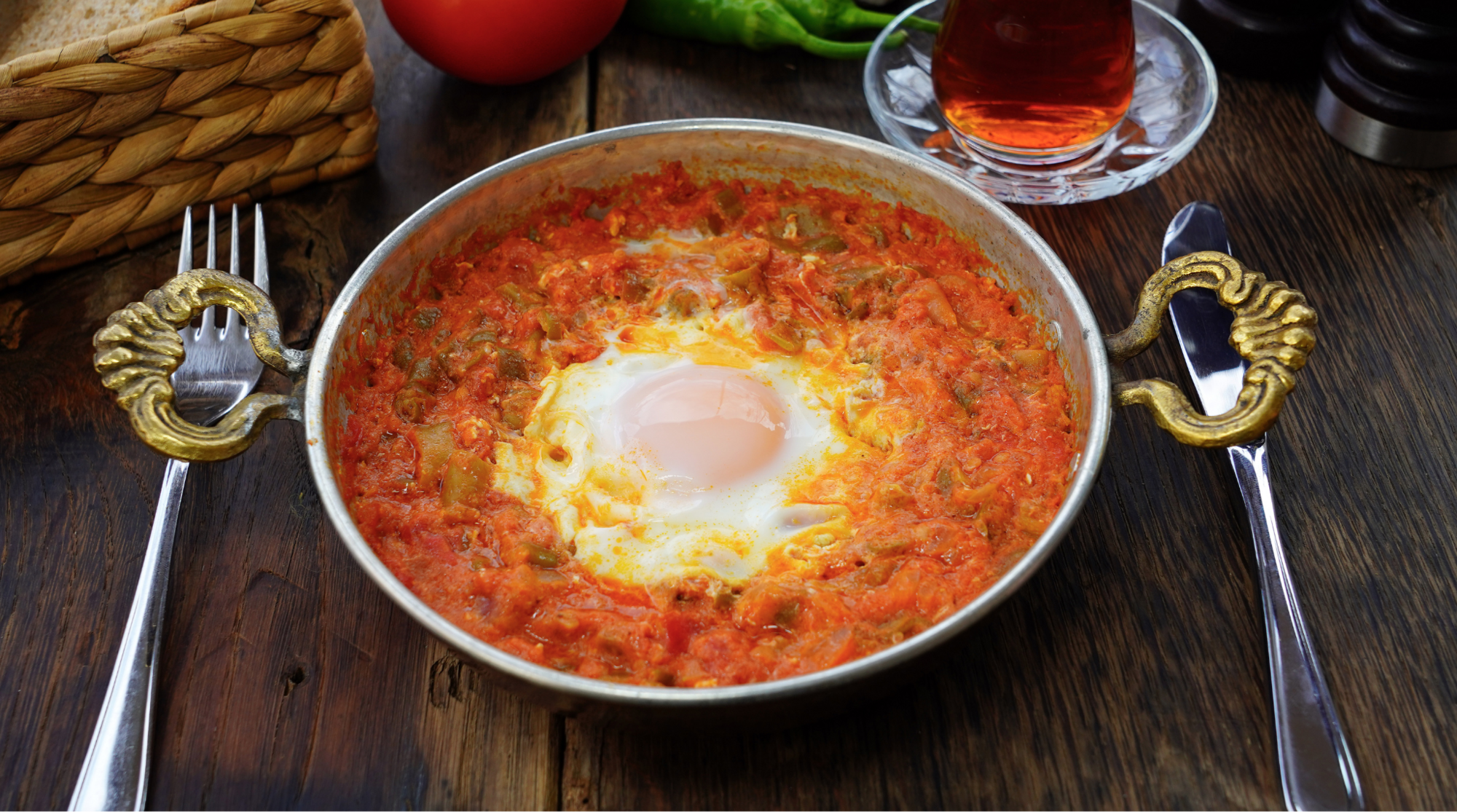 - Menemen wird traditionell in der Pfanne serviert, sodass es direkt am Tisch warm bleibt.