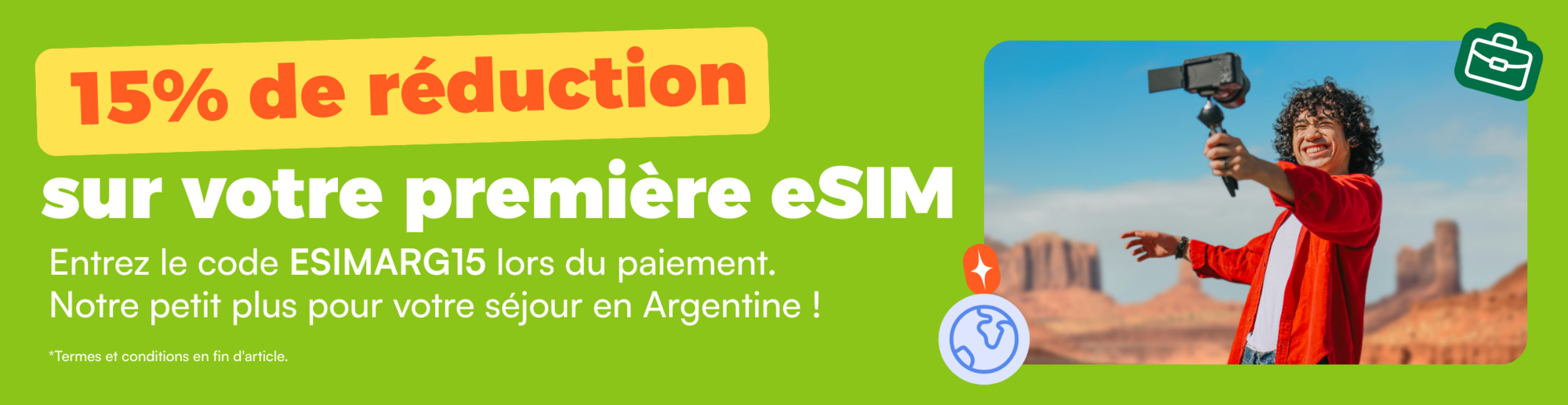 📲 Ne partez pas sans votre connexion internet ! Faites le plein de data avant de partir avec une eSIM pour l'Argentine. Votre code de bienvenue vous donne -15% sur votre première eSIM : ESIMARG15