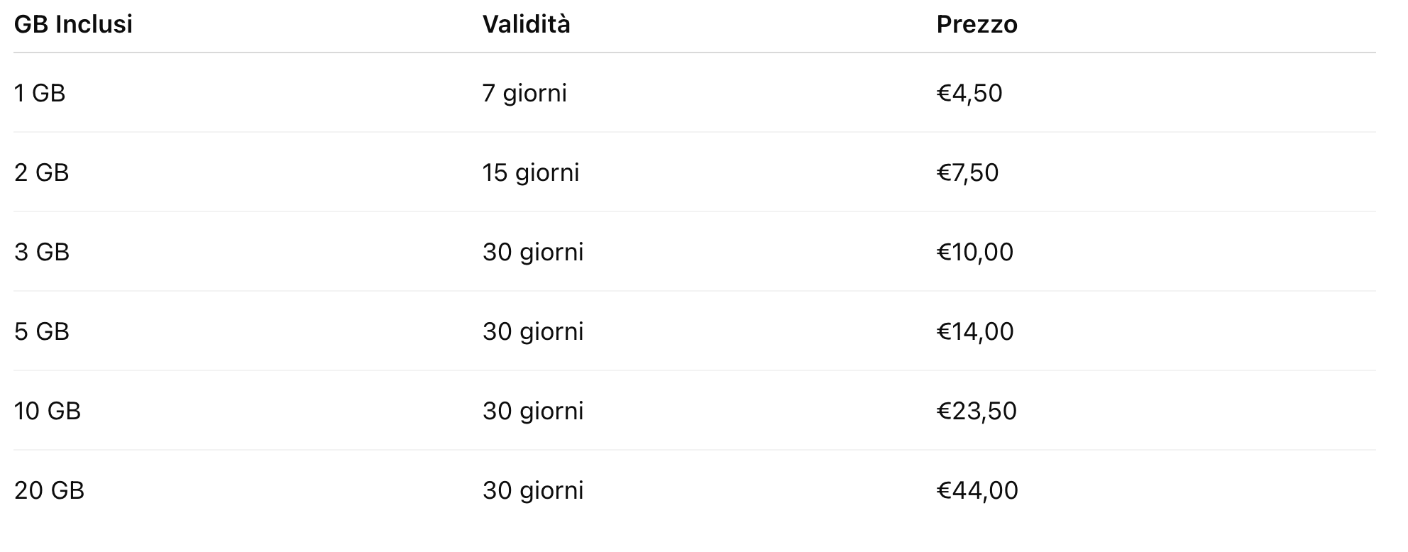 I pacchetti disponibili coprono diverse esigenze: da brevi soggiorni a viaggi più lunghi, con tagli che vanno da 1 GB a 20 GB e durate da una settimana fino a 30 giorni.