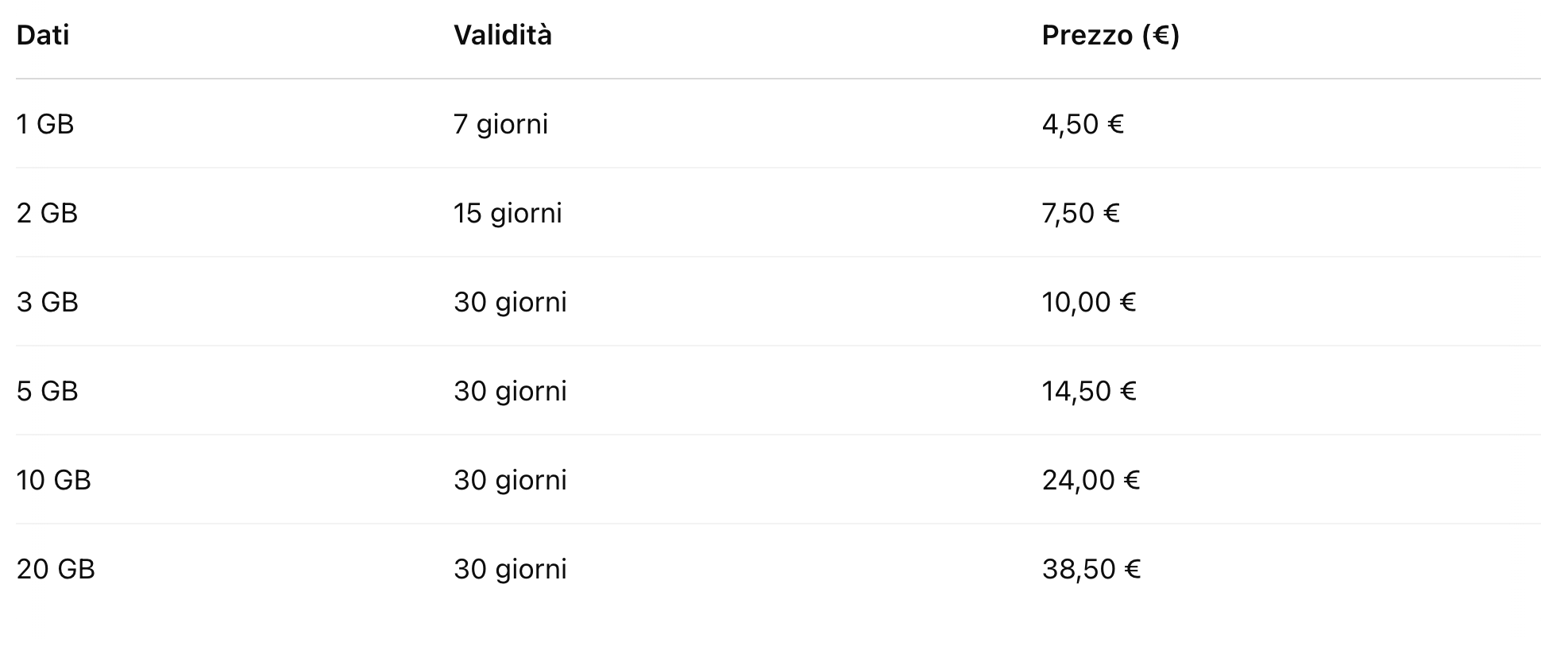 Le opzioni disponibili includono pacchetti dati che variano da 1 a 20GB, con validità che vanno da 3 a 30 giorni: